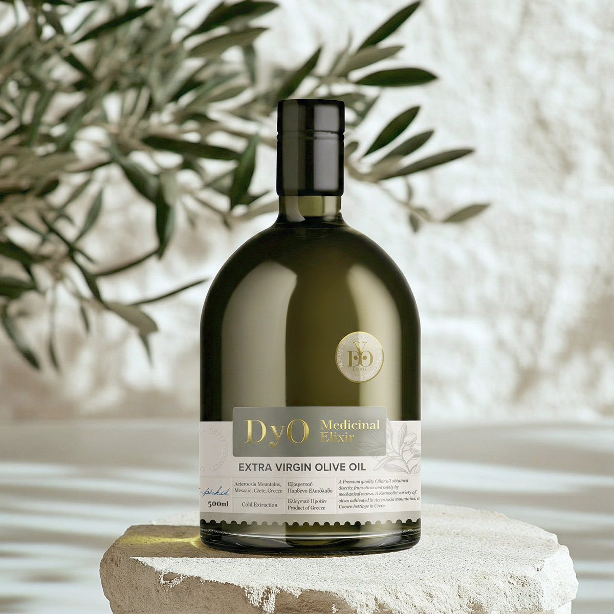 Το DyO Medicinal Elixir είναι το αγουρέλαιο του DyO Estate, το πρώτο λάδι της χρονιάς από άγουρες, πράσινες ελιές (τέλη Σεπτεμβρίου–Οκτωβρίου). Πρόκειται για εξαιρετικά παρθένο ελαιόλαδο με έντονο πράσινο χρώμα, πικρή–πικάντικη γεύση και άρωμα φρέσκιας ελιάς. Έχει πολύ χαμηλή οξύτητα και πολύ υψηλή συγκέντρωση πολυφαινολών, ολεοκανθάλης και ολεασίνης.